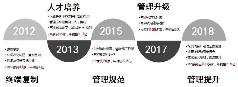 ▼在第一期项目结束后,海伦完成了终端标准打造,为后续全国复制奠定了基础,在项目结束后,海伦团队运用三大连锁系统,进行标准化落实复制,进行区域样板市场的打造,在这个过程中,总部所在地武汉区域的样板复制取得成功,同时,随着企业规模的扩大和跨区域经营,单纯粗放式的管理模式已经难以支撑企业的快速发展,公司的连锁运营管理的问题层出不穷,其中区域负责人才培养遇到了瓶颈区域管理规范化的问题凸显。