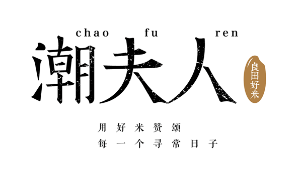 logo:潮夫人是一个倡导追寻朴实自然,发现平凡生活中的惊喜与美好的品牌,基于这种“美好与质朴”的品牌调性,潮夫人创作将字体logo做到了极致。中文字体,不做夸张的处理,而是遵循了品牌原本内敛、美好,在平淡生活中发现小惊喜的调性,呈现出古朴而有质感的笔锋。通过细节精修,有粗有细,挺拔有力,更显品质与美感,并对字体加艺术化肌理处理,隐约中藏着米粒的斑白之感,传递出潮夫人朴实、朴拙、真实的气质。