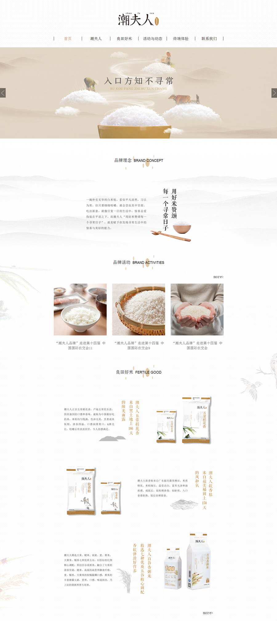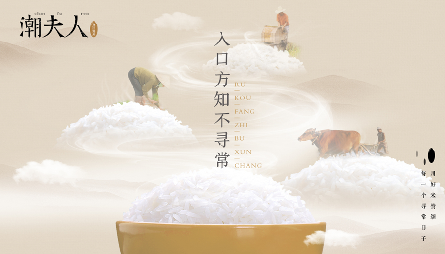 菜再喜欢,天天吃都会腻,但唯独米饭,就算一年365天都在吃,你也永远不会腻,它的平凡淡然之处就在这里,就像我们寻常的生活一样,我们想把它做得非常淡,非常简单,非常质朴,其他品牌在讲香软弹滑,我们在讲一种米的人生,米的态度,这才是潮夫人兢兢业业十五年,从大地中得到的教育和领悟。就像日本的稻作文化一样,我们也是回归中国传统的农耕文化,提倡一种质朴美好的生活方式。
