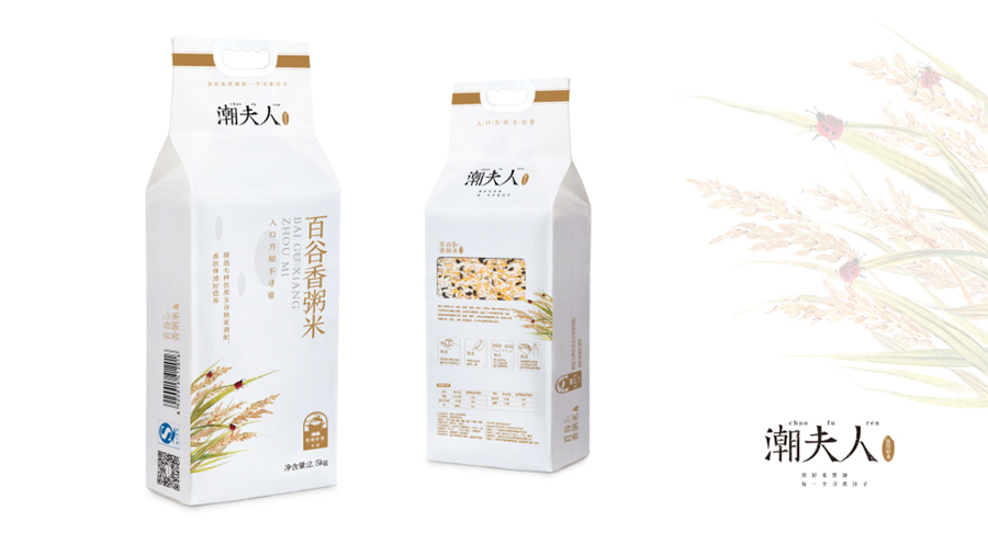 产品包装: 选取对农作物有益的昆虫或与自然农作有关的动物元素,以时尚朴素的插画形式表现,呈现出潮夫人大米自然、天然、纯净、生态的良好生长环境,同时表达了稻谷丰收的喜悦,及对美好生活的向往。