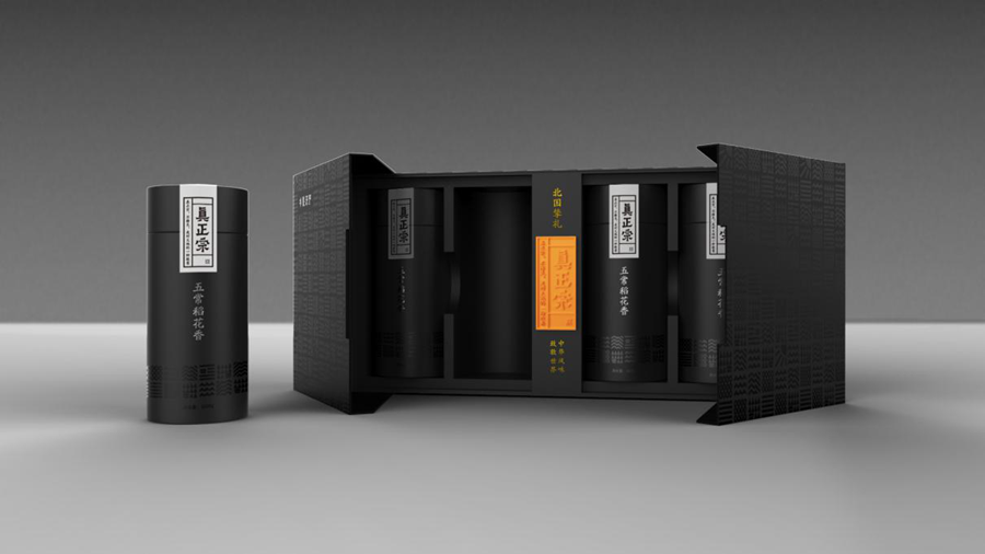 终端货架上的产品都是五颜六色,碎片化的,所以在包装上,我们先用饱和度高的明亮的大色块抓住视觉,金色的字体设计传递着一种尊崇和力量感,下半部分则采用插画视觉锤,诉说着时间历史的演变沉淀,在一众扁平化的包装中跳脱出来。材质上用古朴环保的牛皮纸,既现代亦质朴。