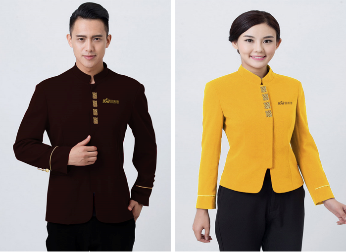 不是医院的白色,也不是美容院那种跳跃夸张的颜色,而是选用专业、稳重、有亲和力的熟褐色和金黄色,也就是我们的vi主色,如此便没有医院的冰冷和美容院的轻佻,比较中和,简单有亲和力,加上传统的扣子纹理和整个服装形式更体现专业感。